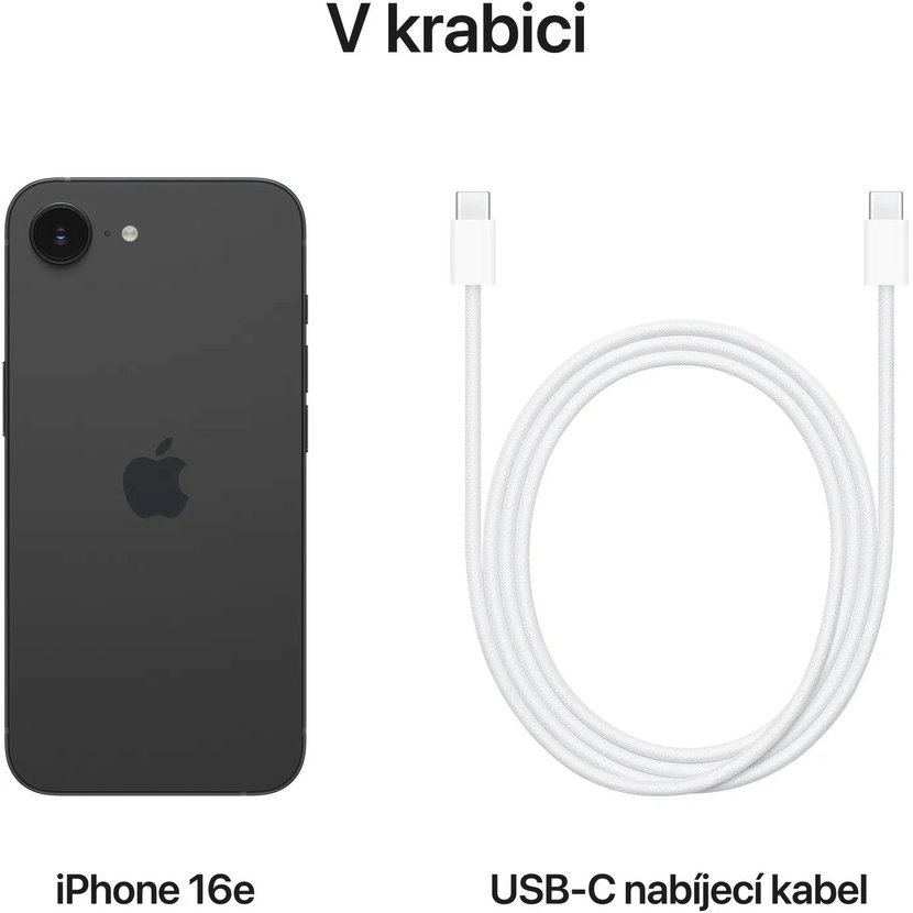 Obsah balení: iPhone 16e, napájecí USB-C/USB-C, jehla pro vyndání sim karty, manuál a ostatní dokumentace