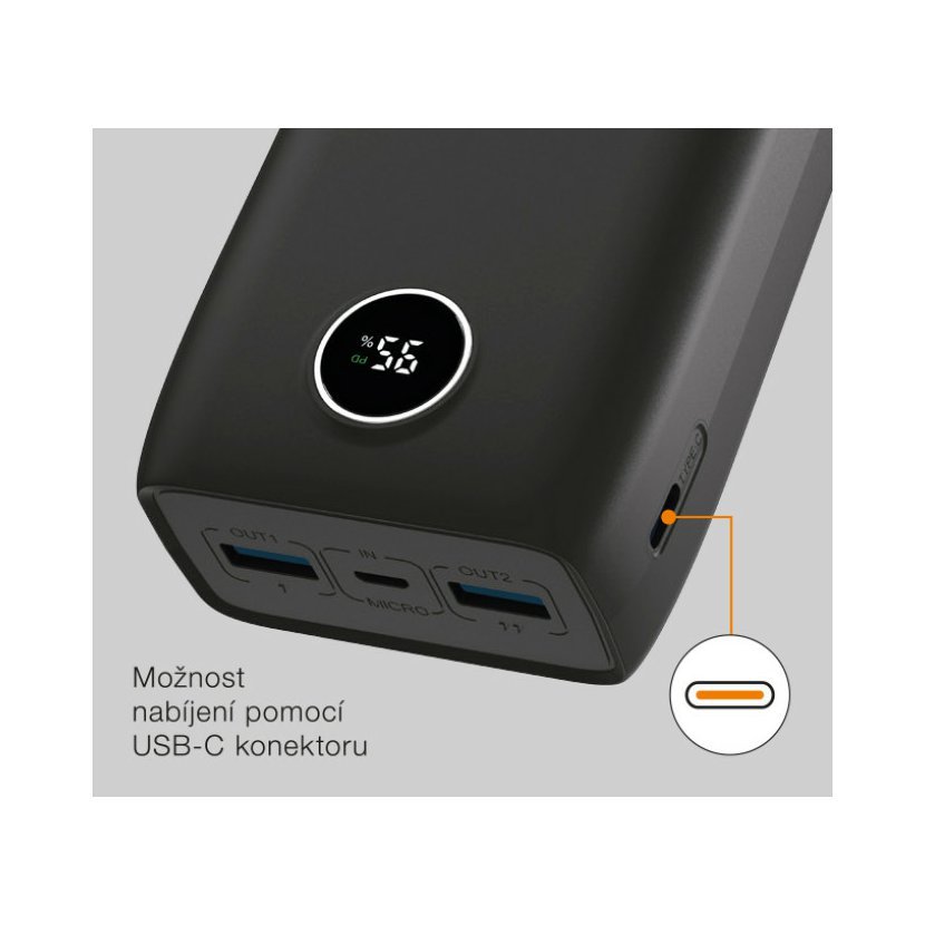 Powerbanka disponuje porty USB s podporou Quick Charge 3.0, micro USB a USB-C s podporou rychlého nabíjení Power Delivery.