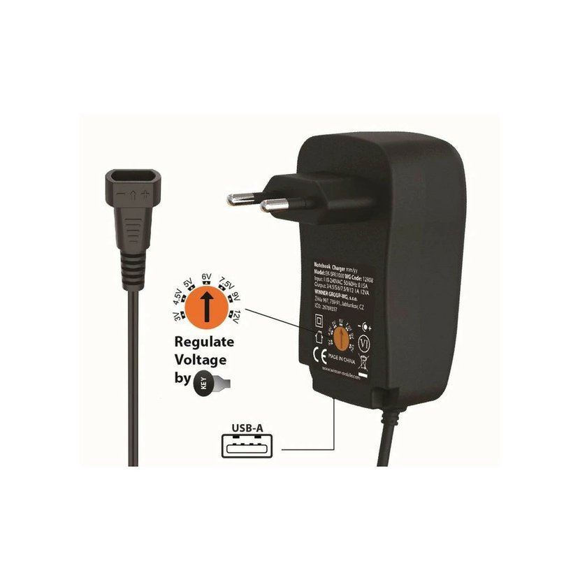 Výstupní napětí: 3/4.5/5/6/7.5/9/12V DC.
